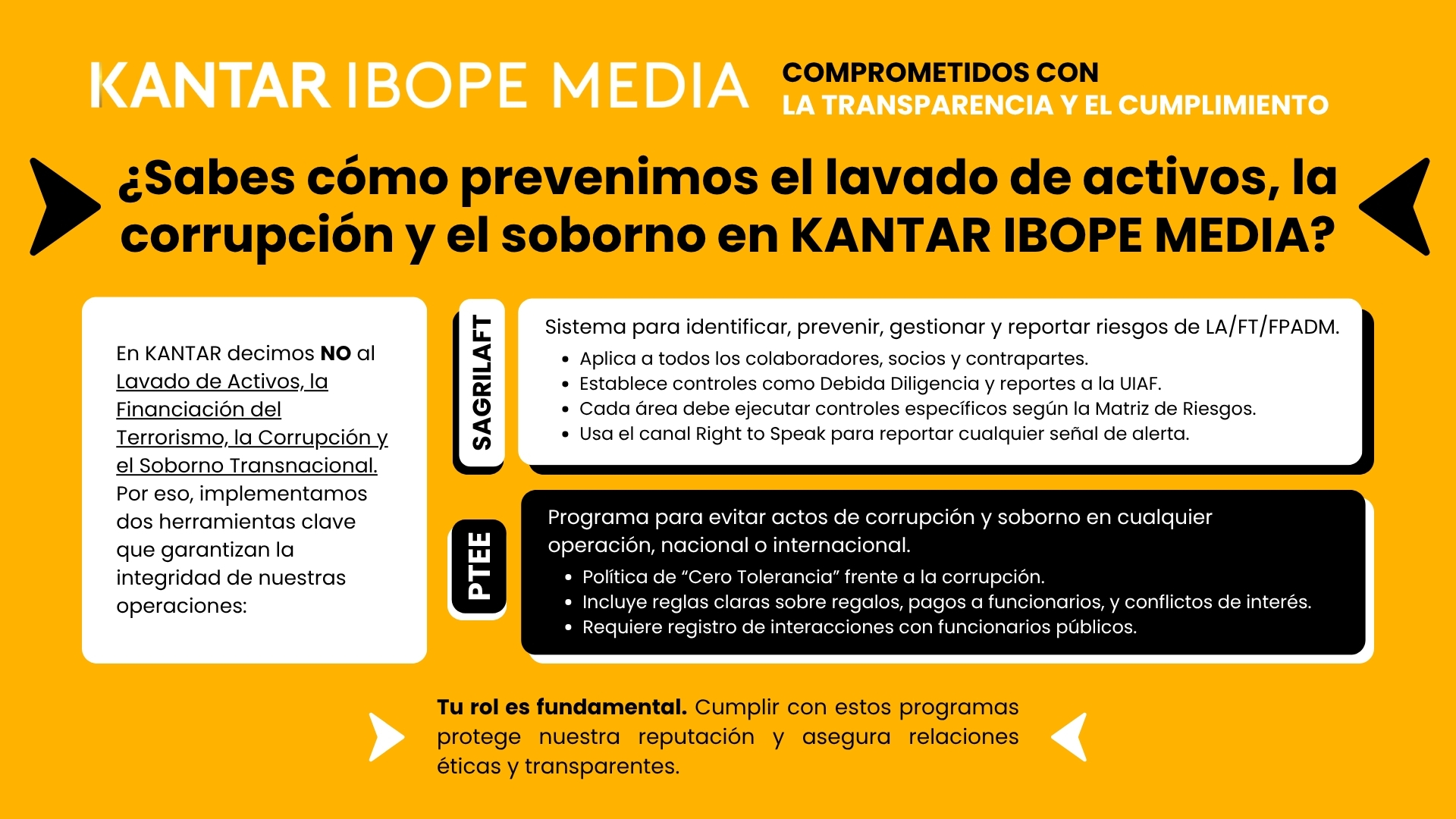 El cumplimiento está a disposición de todos los empleados, proveedores, clientes y la comunidad con la garantía de anonimato, secreto y sin ningún tipo de represalia.